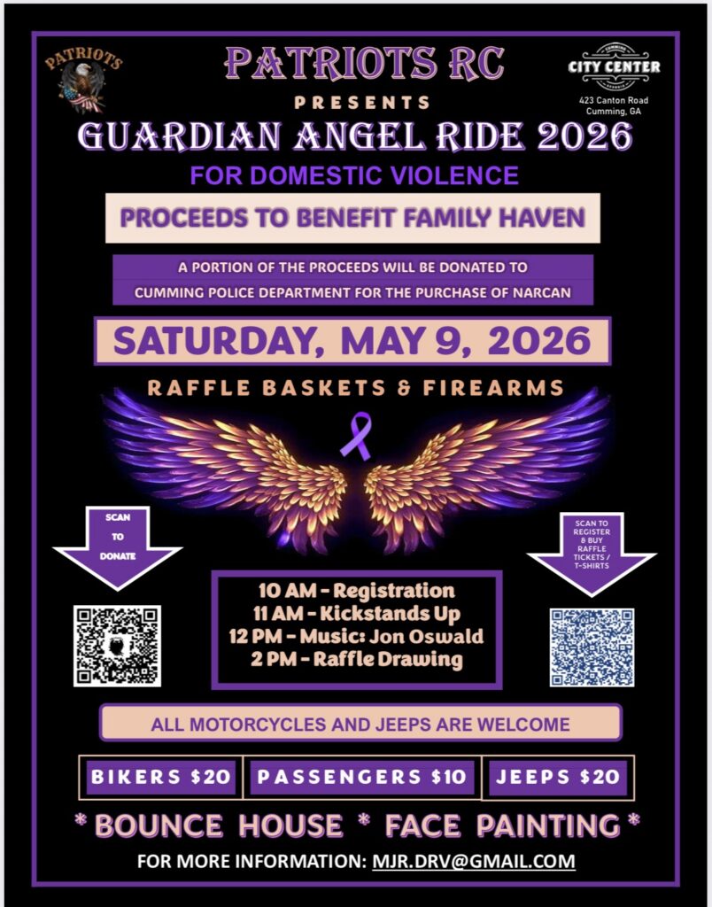 Get ready to rev up for our Fourth Annual Guardian Angel Ride on Saturday, May 9th, benefitting Family Haven and victims of domestic violence, with a portion of the proceeds going to the Cumming Police Department. Registration at 10am, kickstands up at 11. Please plan to join us for these worthwhile causes, and stay for the after party with live music, raffles, face painting, and a bouncy house for the kids!