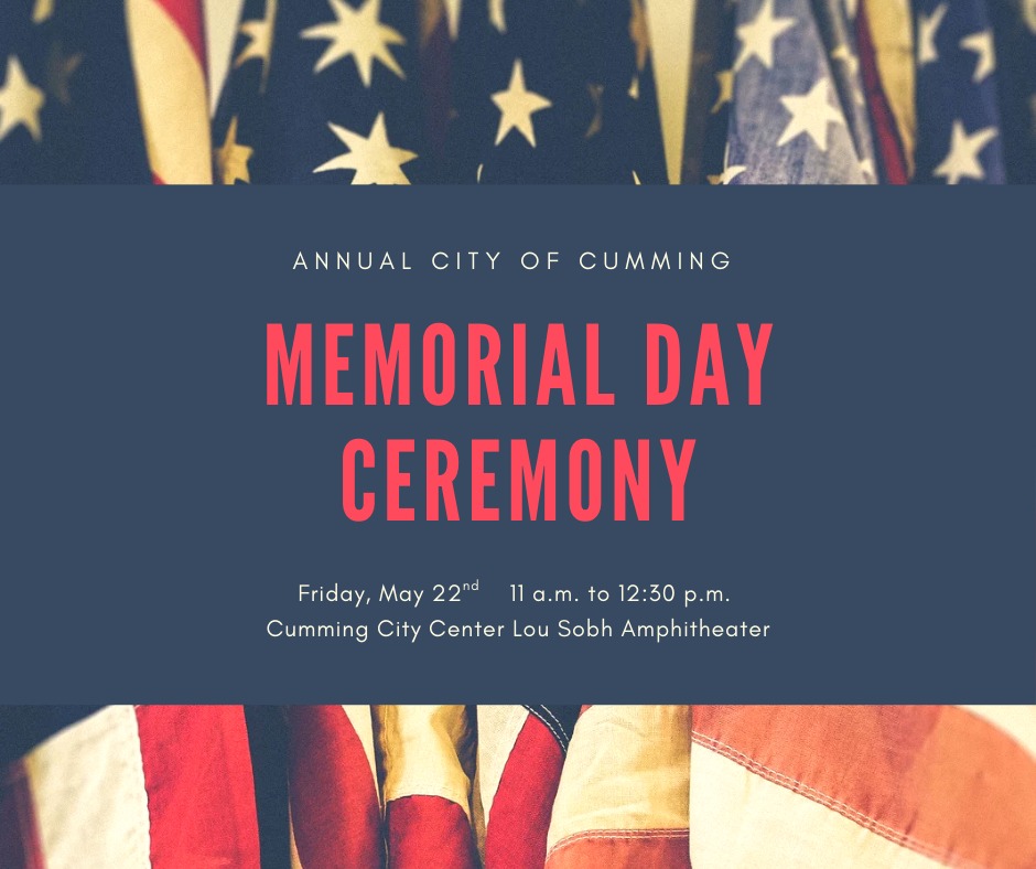 Join the City of Cumming for our Annual Memorial Day Ceremony at the Cumming City Center Lou Sobh Amphitheater. We will honor fallen veterans with new additions to the City's Avenue of Flags display, hear a keynote address from Tom McDonald (Retired Army Colonel), and more. Event will be held rain or shine; please plan […]